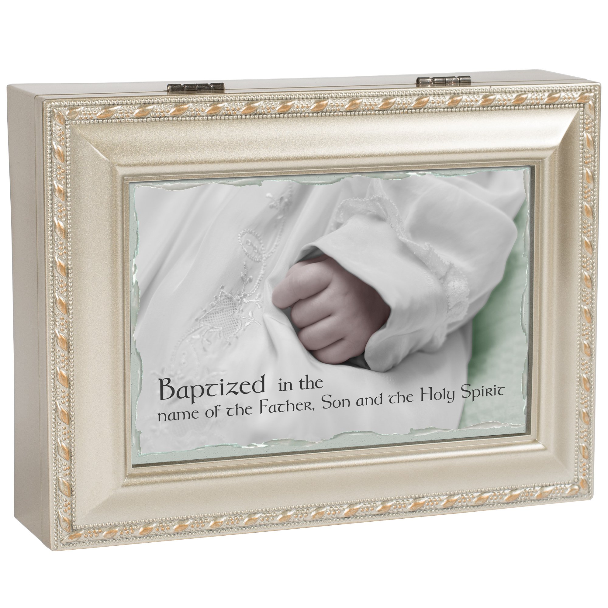 Cottage Garden Baptized in The Name of Baby Champagne Silver Finish Jewelry Music Box Plays Jesus Loves Me