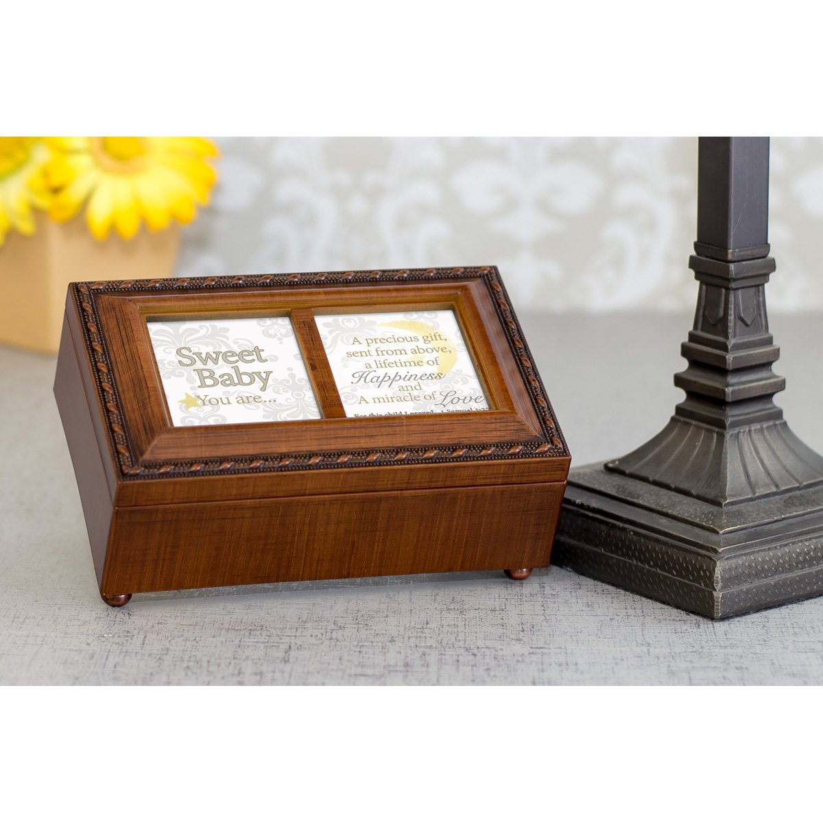 Cottage Garden Sweet Baby Precious Gift Woodgrain Rope Trim Jewelry Music Box Plays Jesus Loves Me